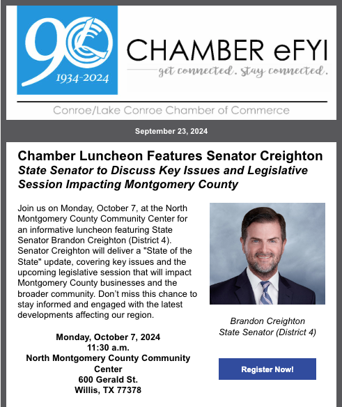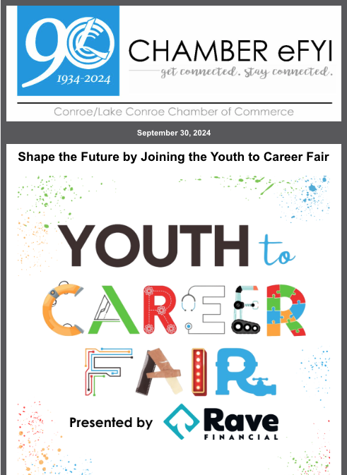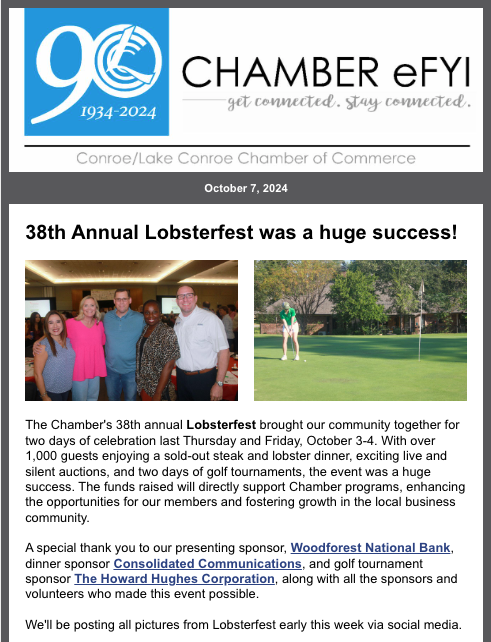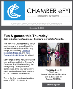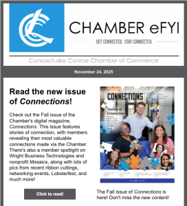 Publications Dec. 8, 2025: Fun & games at Morning Mingle! Dec. 1, 2025: Fun After Five & Elected Official Reception at GuadalaHARRY'S on Dec. 18 Nov. 24, 2025: Read the Fall issue of Connections https://conta.cc/3KdUUAh Join The Chamber The Conroe/Lake Conroe Chamber is here for your business. Engage now to expand your networking opportunities and to be a part of our community’s growth. CONTACT US